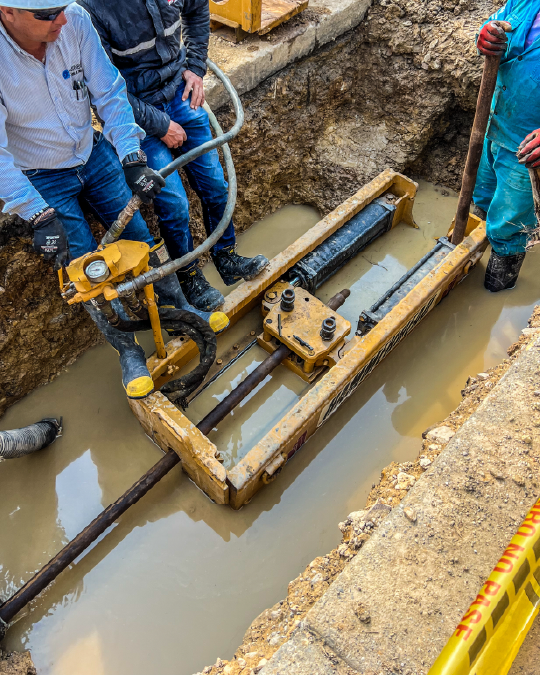 La máquina de restitución reemplaza tuberías fracturables de hasta 60″ y 100 m de longitud, reventando la vieja e instalando una nueva de polietileno del mismo o mayor diámetro.